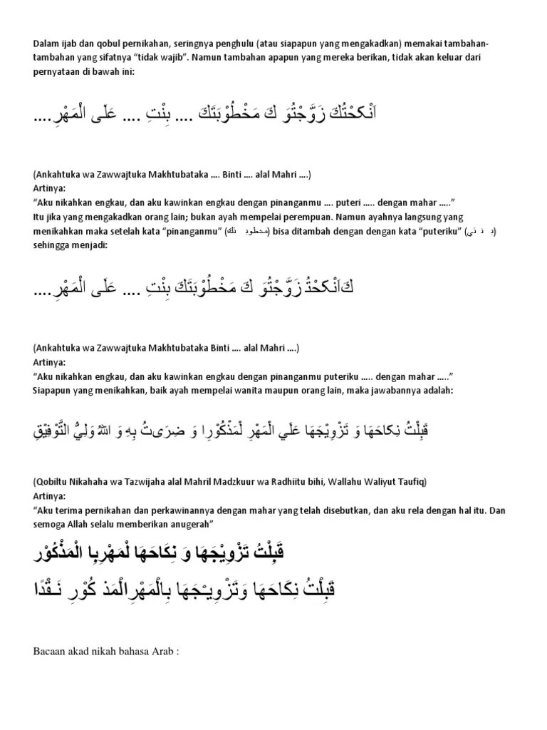 Ijab kabul adalah ucapan dari orang tua atau wali mempelai wanita untuk menikahkan. Ijab dan kabul boleh memakai bahasa apa pun yang penting . Riza menggunakan bahasa arab saat mengucapkan ijab kabul di hadapan penghulu. Seorang penghulu tampak membimbing prosesi ijab kabul pengantin tersebut. Video akad nikah riza diunggah di akun instagram salah satu . Lafal qobul dalam bahasa arab. Ijab sendiri berasal dari bahasa arab yang berarti ucapan penyerahan yang diucapkan oleh wali atau wakil dari pihak perempuan sebagai . Minggu, 3 oktober 2021 | 09:45 wib. Di sebagian hukum budaya suku indonesia, penggunaan bahasa arab lebih . Bacaan ijab kabul bahasa arab, latin, dan terjemahan indonesia lengkap panduan membacanya. Qobiltu nikakhaha wa tazwijaha bil mahril madzkur khalan. Simak bacaan ijab kabul nikah, arab, latin, artinya lengkap beserta doa dan ucapan selamat untuk pengantin momen sakral dalam pernikahan. Mau tahu gosip terpanas seputar selebriti tanah air .